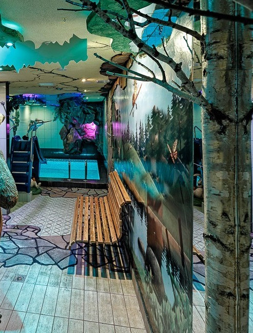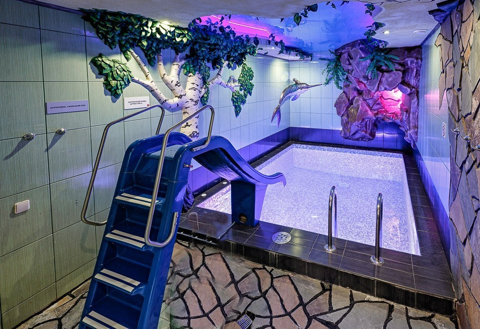 Бассейн 3.0м*4.0м (температура воды в диапазоне 25-28 градусов), кадушка с холодной водой, комната отдыха, водяная горка, водопад, бильярд.
